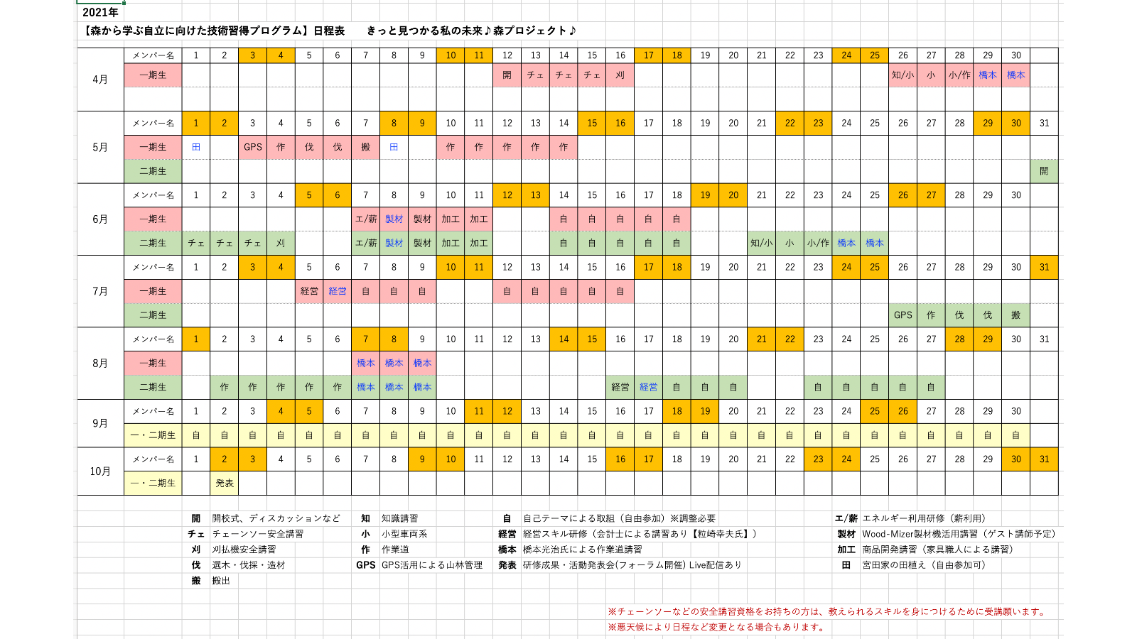 第1期(4月~9月)25日間講習4月12日(月)〜16日(金) 5日間 ◎自伐型林業の山林管理の基礎講習 定員3名〜10名 |